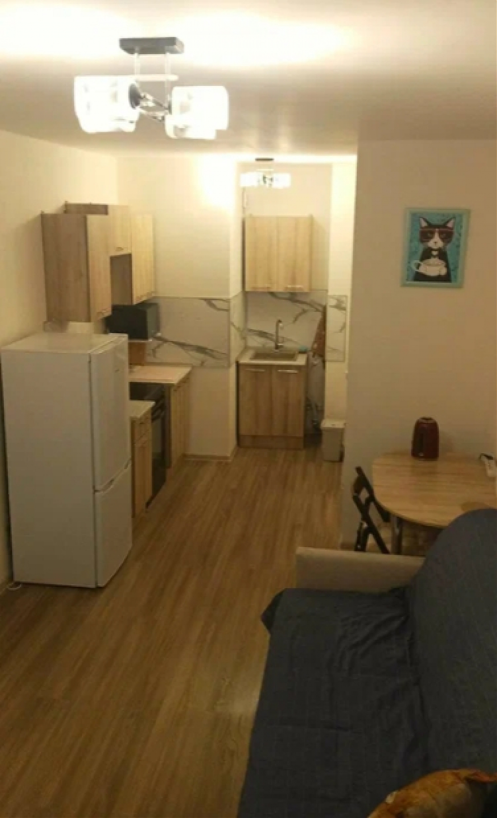 Сдается студия в новом доме на длительный срок. Сдается впервые. Вся мебель новая: холодильник, электрическая плита с духовым шкафом, стиральная машина, микроволновая печь, двухспальный диван, чайник, утюг, гладильная доска, шкаф-купе с зеркалами, пылесос, комод, телевизор, письменный стол со стулом, кухонный стол, барная стойка и два стула, два комплекта постельного белья. Есть:TV, Wi-Fi. В доме две парадных, придомовая территория с местами для отдыха и детской площадкой. На первом этаже пекарня. Рядом с домом автобусная остановка ( маршруты:271,199, 214б,104)
