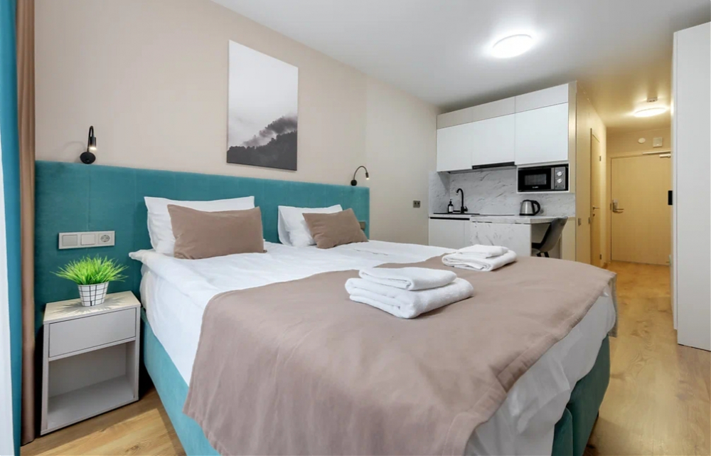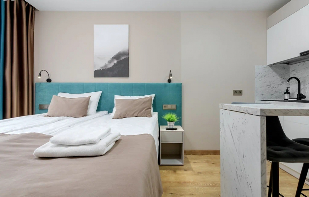 Квартира оборудована ванной комнатой с ванной, кухней с электрической плитой с двумя конфорками, где Вы найдете все необходимое для кулинарных экспериментов. Из техники: холодильник, чайник, фен. К Вашим услугам также гладильные принадлежности. Для 2-х жильцов ( двуспальная кровать) • Мы обеспечиваем безопасность системой видеонаблюдения в общих зонах.