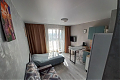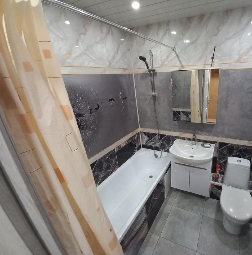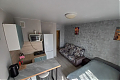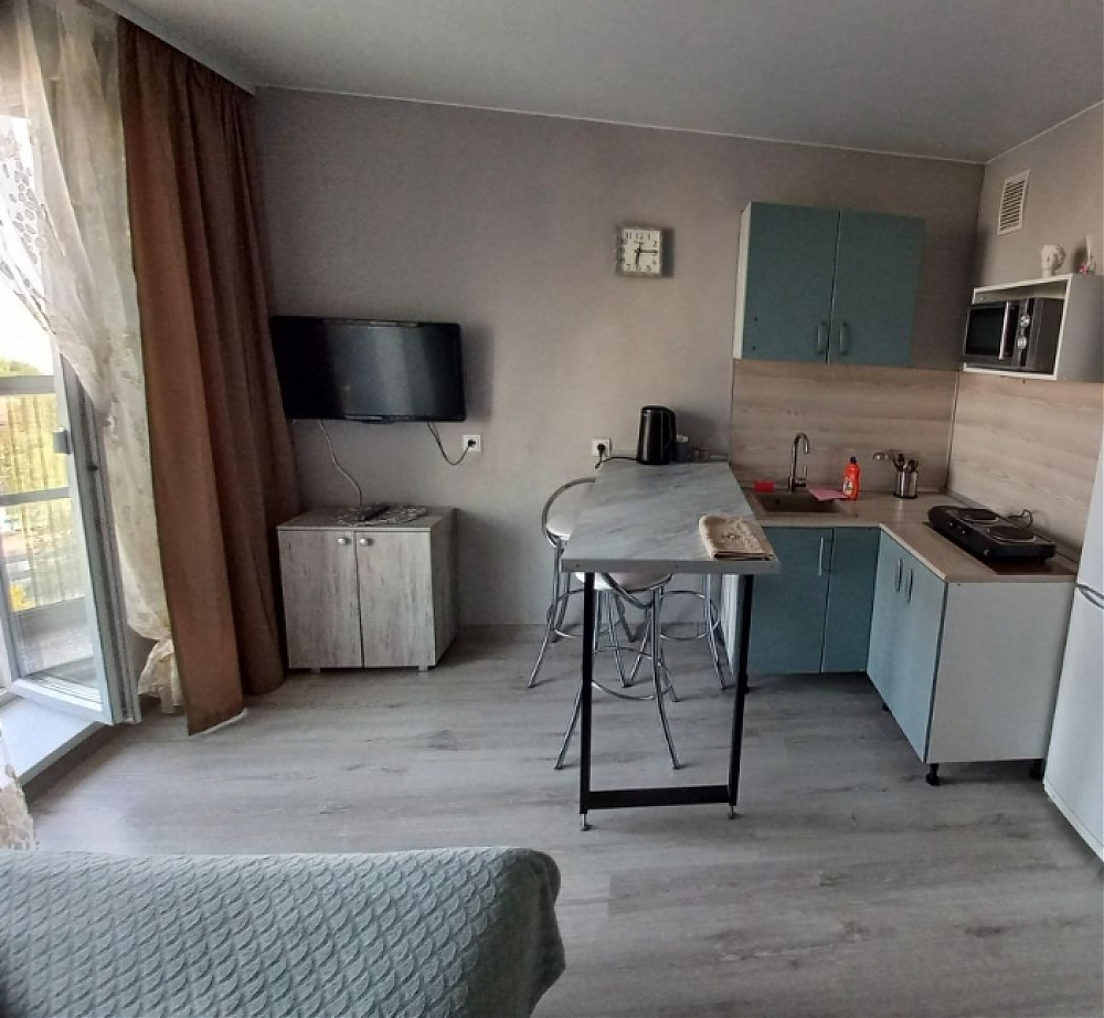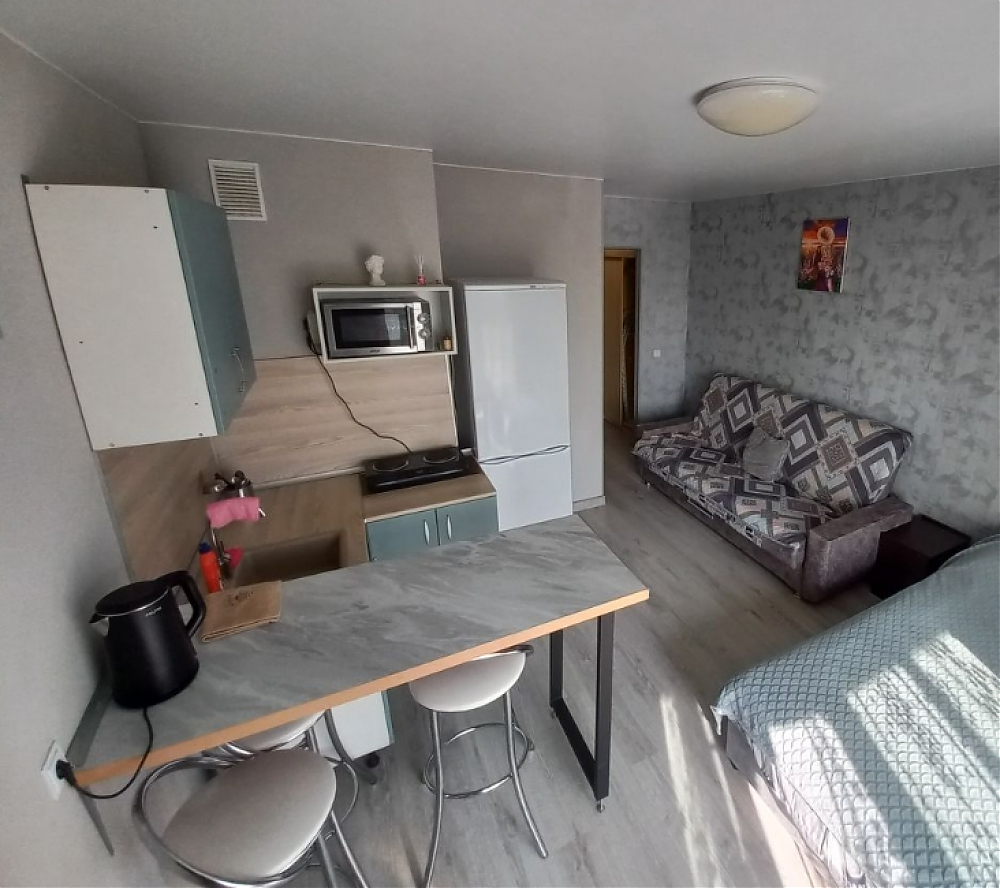 Квартира полностью готова к проживанию. В комнате и на кухне есть вся необходимая мебель, а также бытовая техника: холодильник, телевизор и стиральная машина. Санузел совмещенный, оборудован ванной.