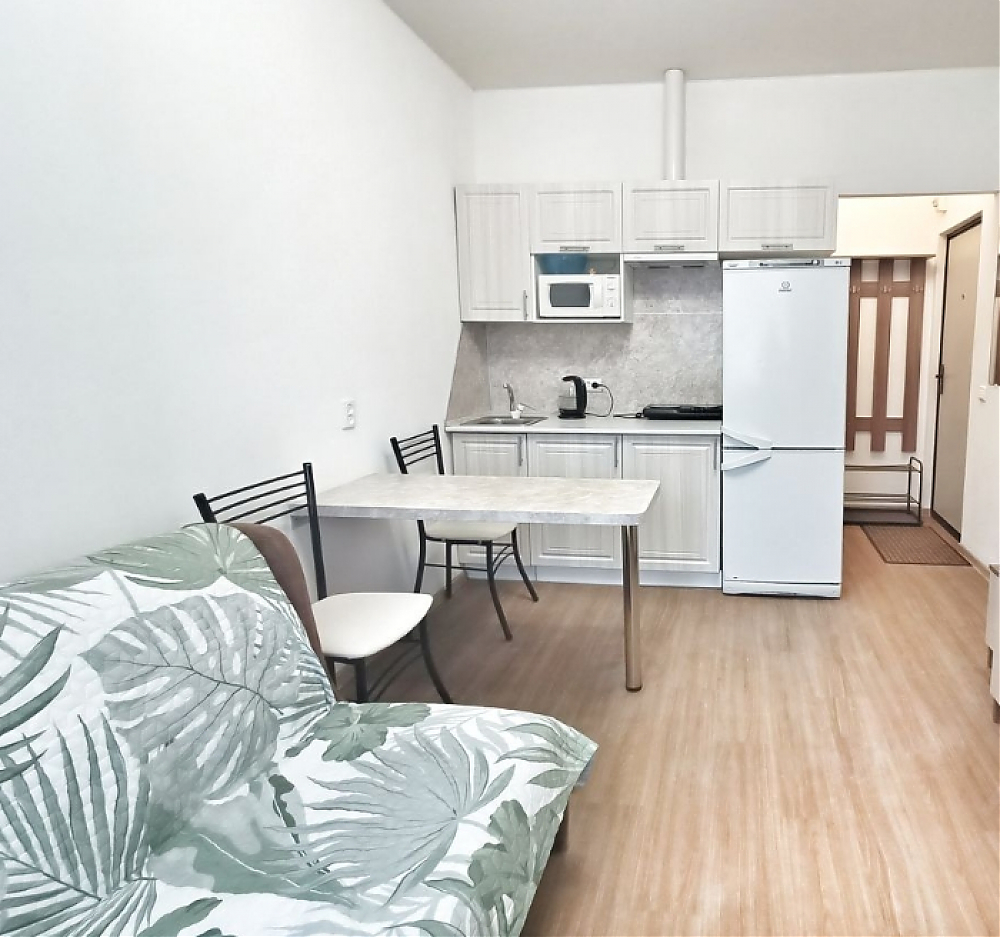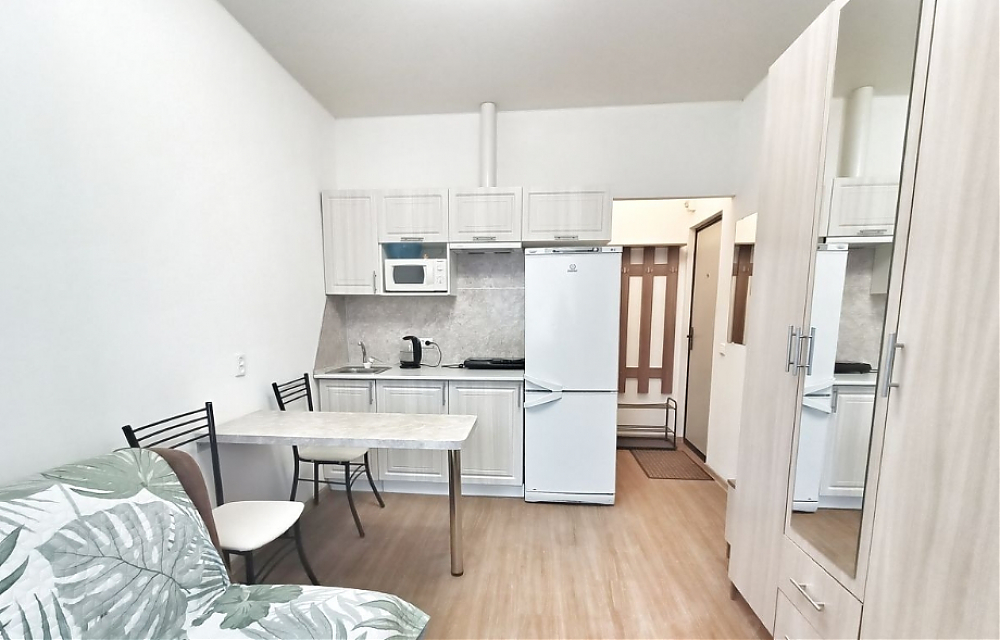 Квартира с евроремонтом, полностью готова к проживанию. В студии есть удобная мебель как на кухне, так и в жилой зоне. Для вашего комфорта установлены холодильник, телевизор и стиральная машина. Санузел совмещённый, оборудован ванной. Окна выходят во двор, поэтому в квартире всегда тихо и спокойно.