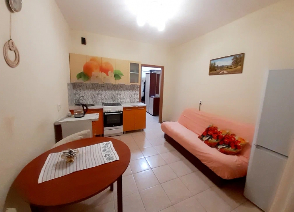 Очень просторная квартира с хорошим ремонтом! Большая кухня с выходом на балкон. Есть вся мебель (в комнате большой диван-аккордеон, раскладное кресло, на кухне гостевой диван-книжка), бытовая техника (большой холодильник, микроволновка, электроплита с духовкой, стиральная машина), посуда. Тихие соседи. Развитый район, рядом есть все для жизни и отдыха: школа, садик, больница, магазины, кафе, рынок, прогулочная зона вдоль р. Охта, парк Охтинская Долина.