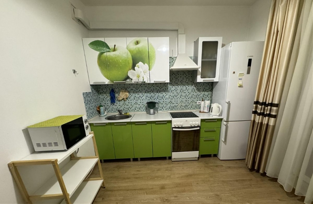 Квартира чистая, без необходимости делать косметический ремонт. Есть все необходимое для жизни: в гостиной шкаф, стол и большой раскладной диван; на кухне холодильник, плита с духовкой, электрический чайник и микроволновая печь; в ванной стиральная машина и шкаф для вещей(на фото всё видно). Большой широкий балкон. Окна выходят на Комендантский проспект, солнечная сторона. Остановка напротив дома, на общественном транспорте до метро ехать 15-20 минут.