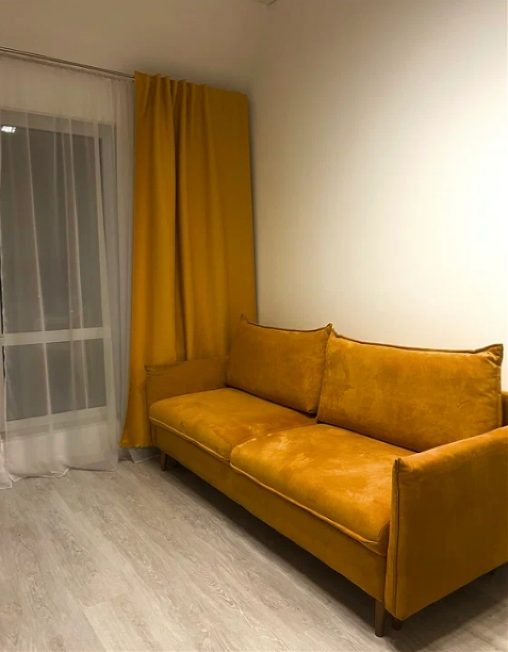Основные характеристики: - Яркий интерьер: квартира оформлена в теплых и солнечных тонах. Жёлтый диван и шторы создают атмосферу уюта и радости, наполняя пространство светом и позитивом.