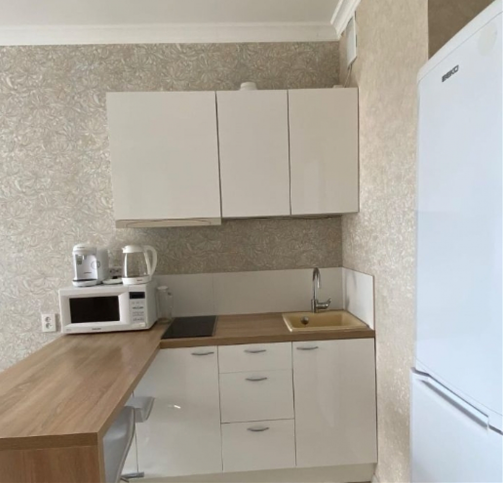В квартире выполнен косметический ремонт. Пространство студии обустроено мебелью на кухне и в комнате, что позволяет сразу же комфортно заселиться. Установлены все необходимые бытовые приборы: холодильник, телевизор и стиральная машина, чайник, микроволновая печь. Санузел совмещённый, оборудован душевой кабиной. Есть лоджия, где можно организовать место для отдыха.