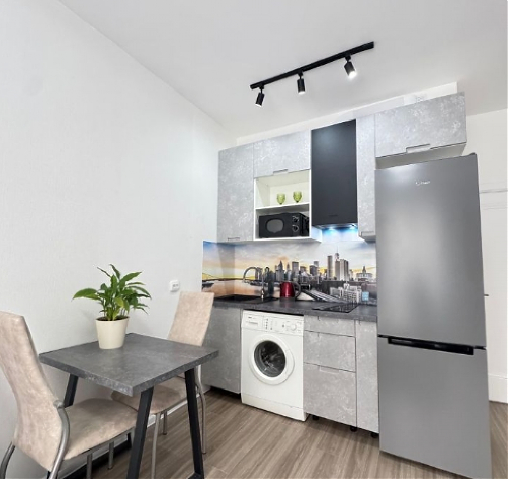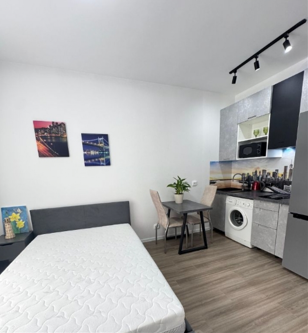 В студии выполнен качественный евроремонт. В комнате и на кухне имеется вся необходимая мебель. Для вашего удобства установлены холодильник и стиральная машина. Санузел совмещённый, с душевой кабиной. Окна выходят во двор, что обеспечивает тишину и уют. Дом оснащён двумя лифтами — пассажирским и грузовым, а также наземной парковкой, поэтому транспортные средства можно без проблем оставить рядом с домом. Инфраструктура района развита: в шаговой доступности школы, детские сады и магазины, что делает проживание здесь комфортным и удобным.