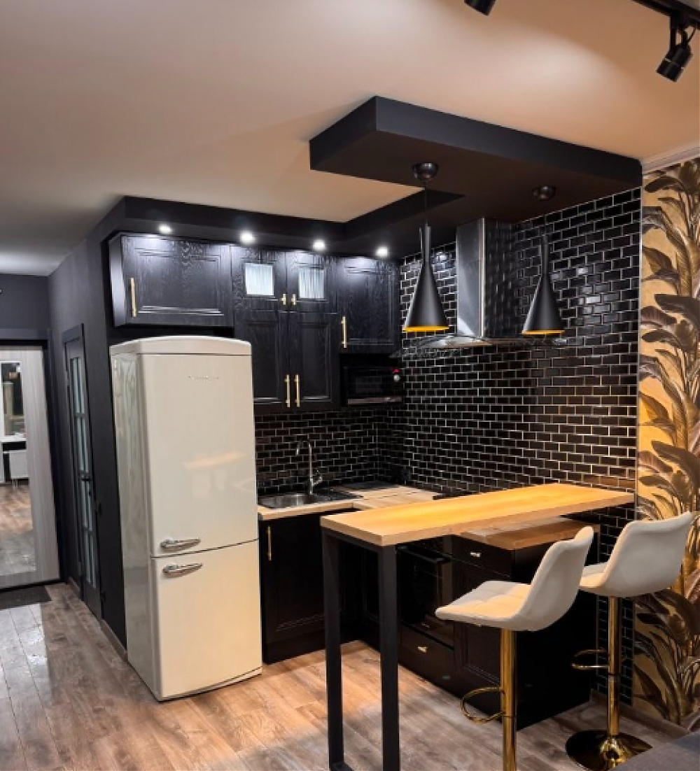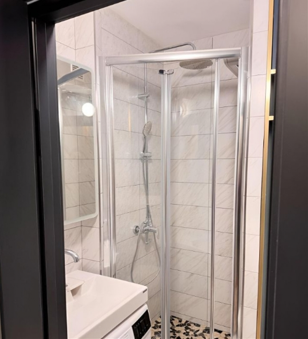Квартира с дизайнерским ремонтом, полностью меблирована. В комнате и на кухне есть вся необходимая мебель, а также техника, включая холодильник, духовой шкаф, индукционную варочную поверхность и стиральную машину. Ванная комната оборудована душевой кабиной. Планировка удобная и функциональная, с продуманным использованием пространства.