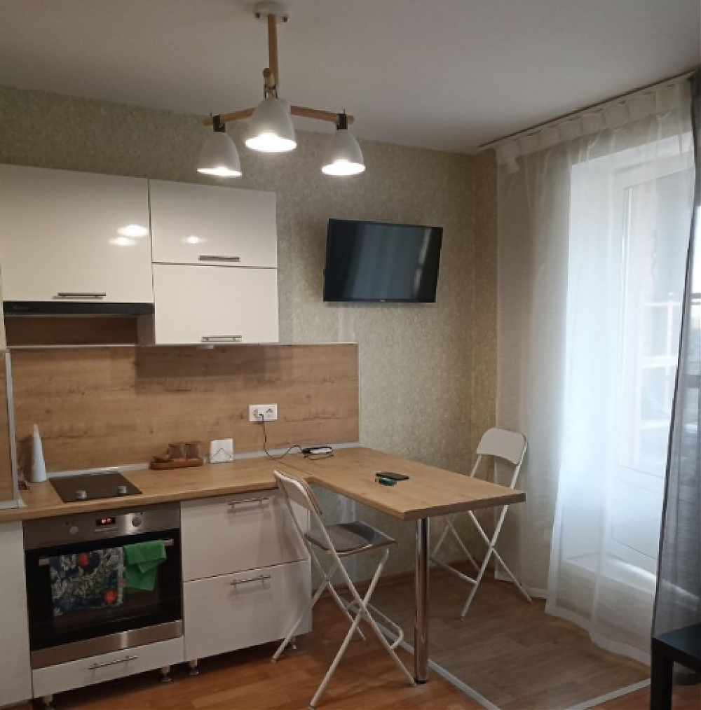 Студия у метро "Парнас" 10 мин. пешком, много транспорта, большая ванная комната, в квартире есть всё для жизни. Тихая и тёплая. 26 этаж -шума нет. Гардеробная комната в наличии, кухня "Ikea" ранних лет, когда мебель делали из дерева.