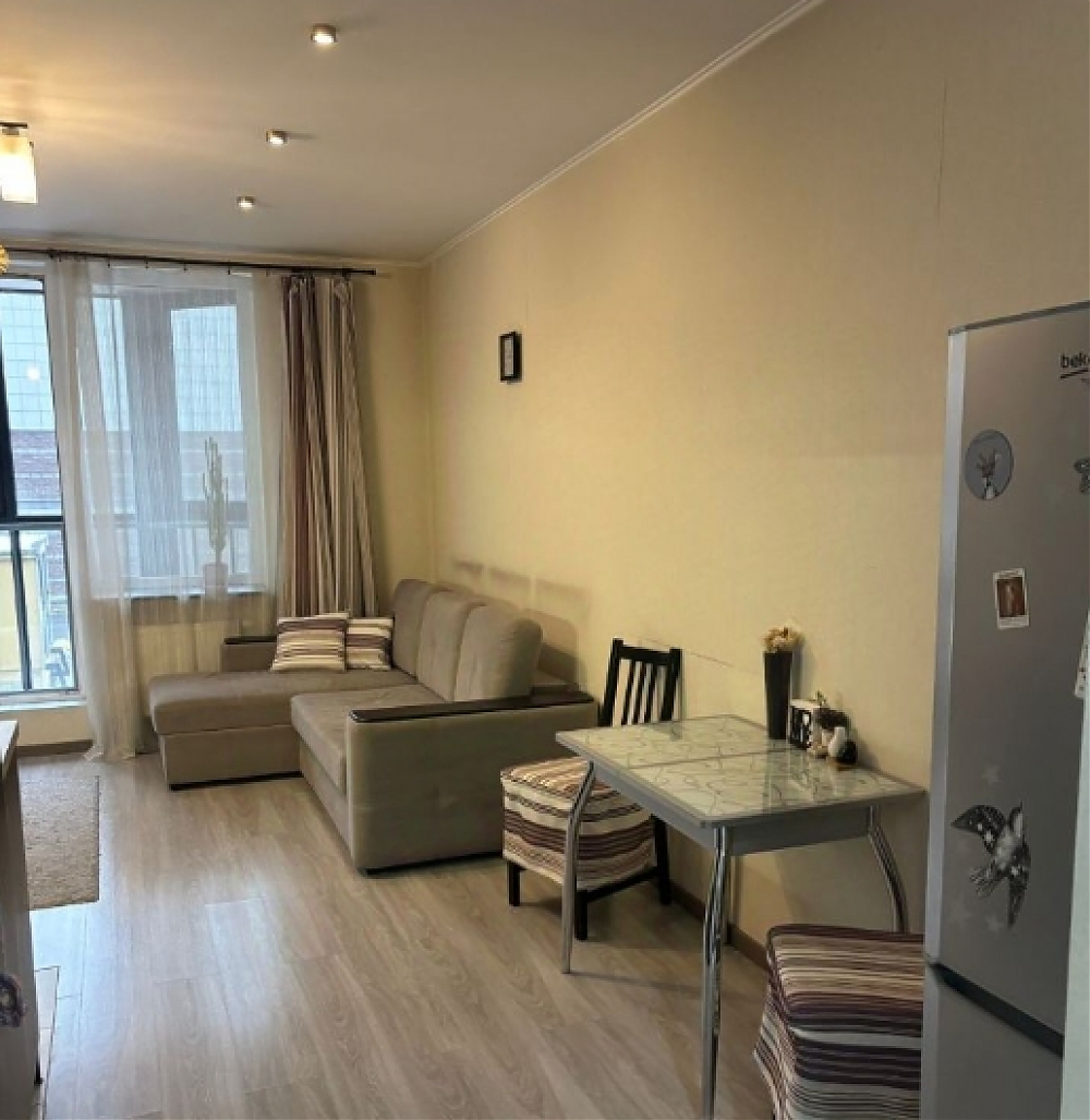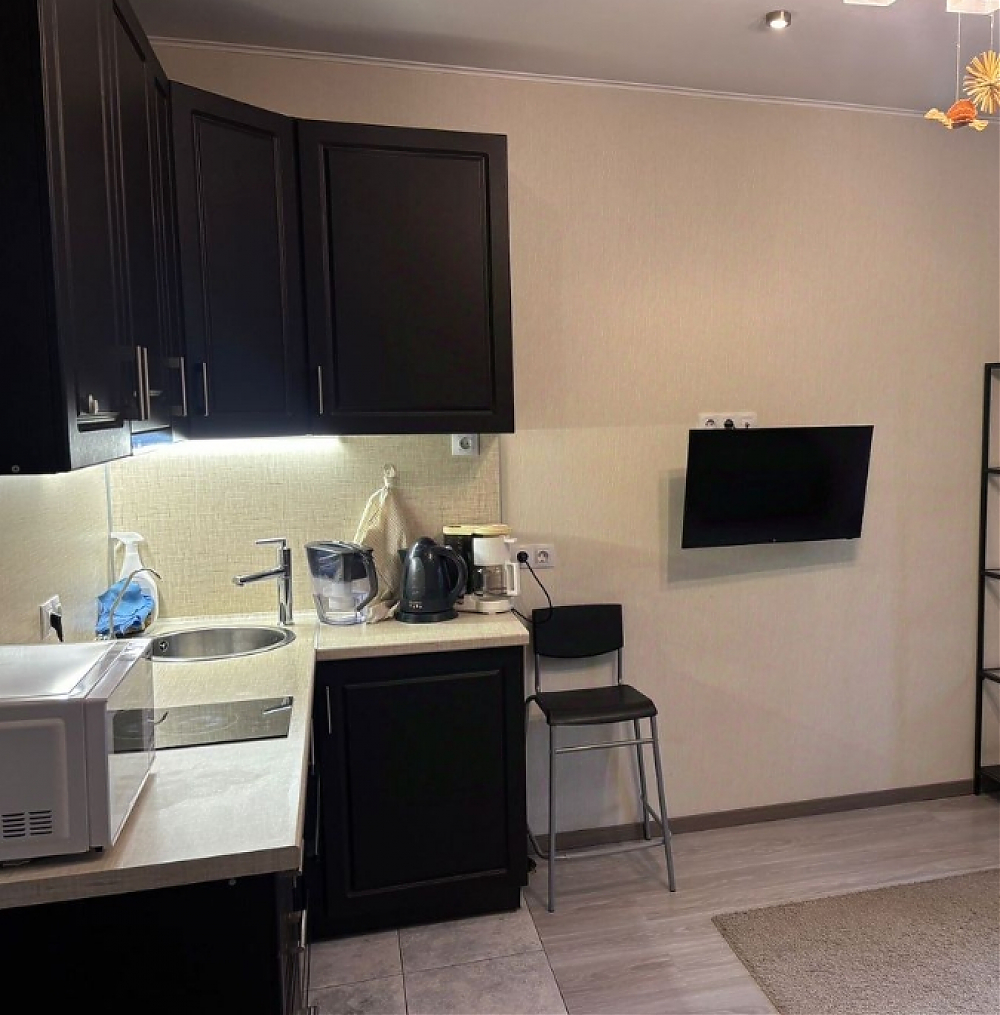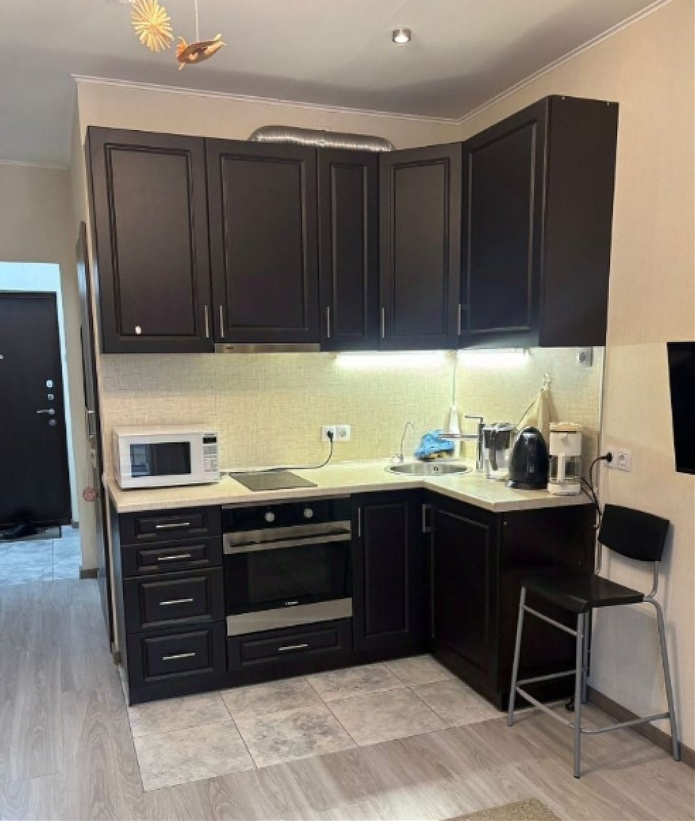 Сдаётся уютная студия в аренду в современном монолитном доме 2014 года постройки. Квартира площадью 28 кв. м .Окна выходят во двор, что обеспечивает тишину и комфорт. Высота потолков 2,75 метра создаёт ощущение пространства и света. В квартире современный евроремонт в серых оттенках, современная мебель в комнате и на кухне, а также вся необходимая техника: холодильник, микроволновая печь, телевизор и стиральная машина. Планировка студии грамотно организована, совмещённый санузел оборудован ванной. Также имеется балкон, где можно насладиться свежим воздухом. В прихожей есть большой шкаф с зеркалом. Так же есть отдельное пространство для хранения вещей.