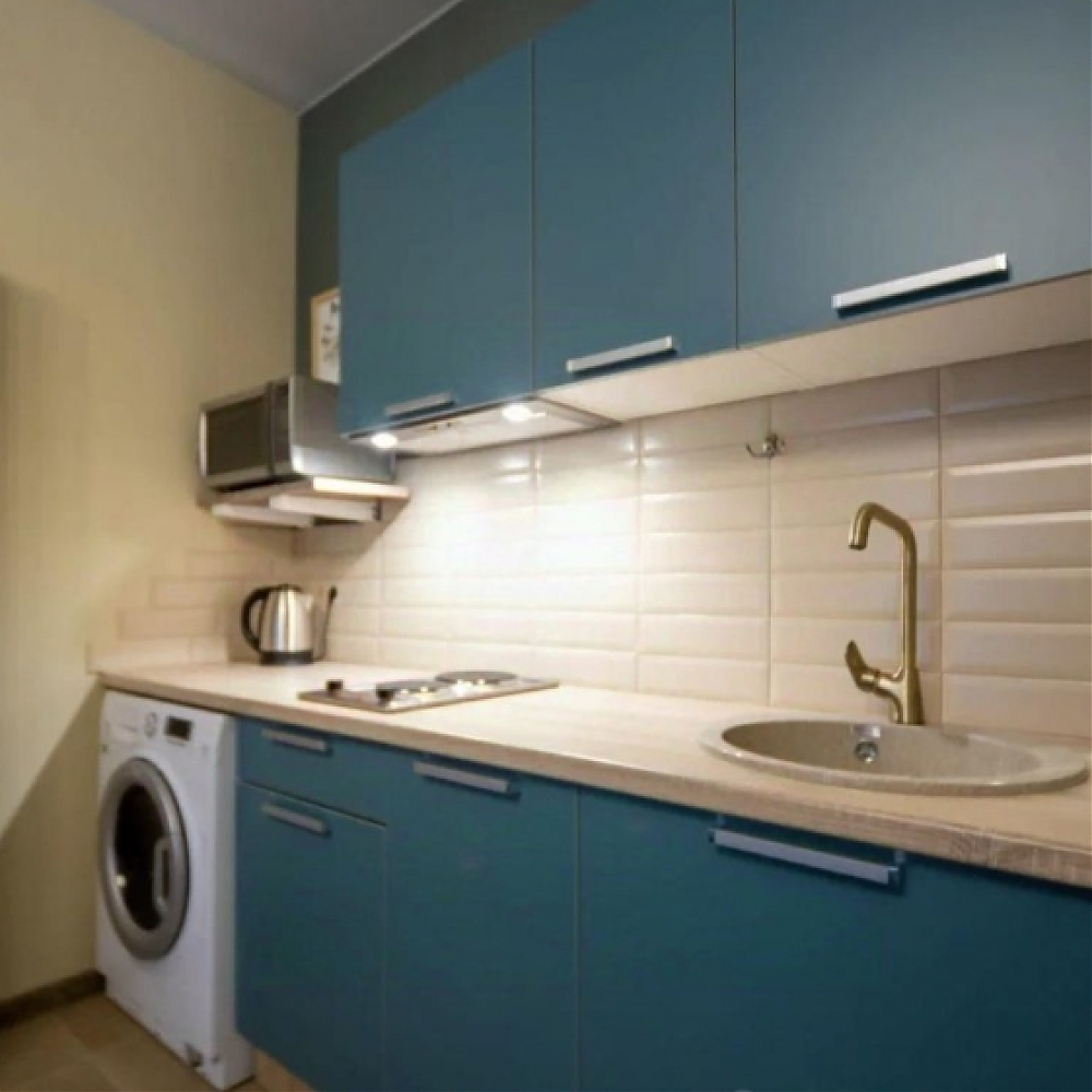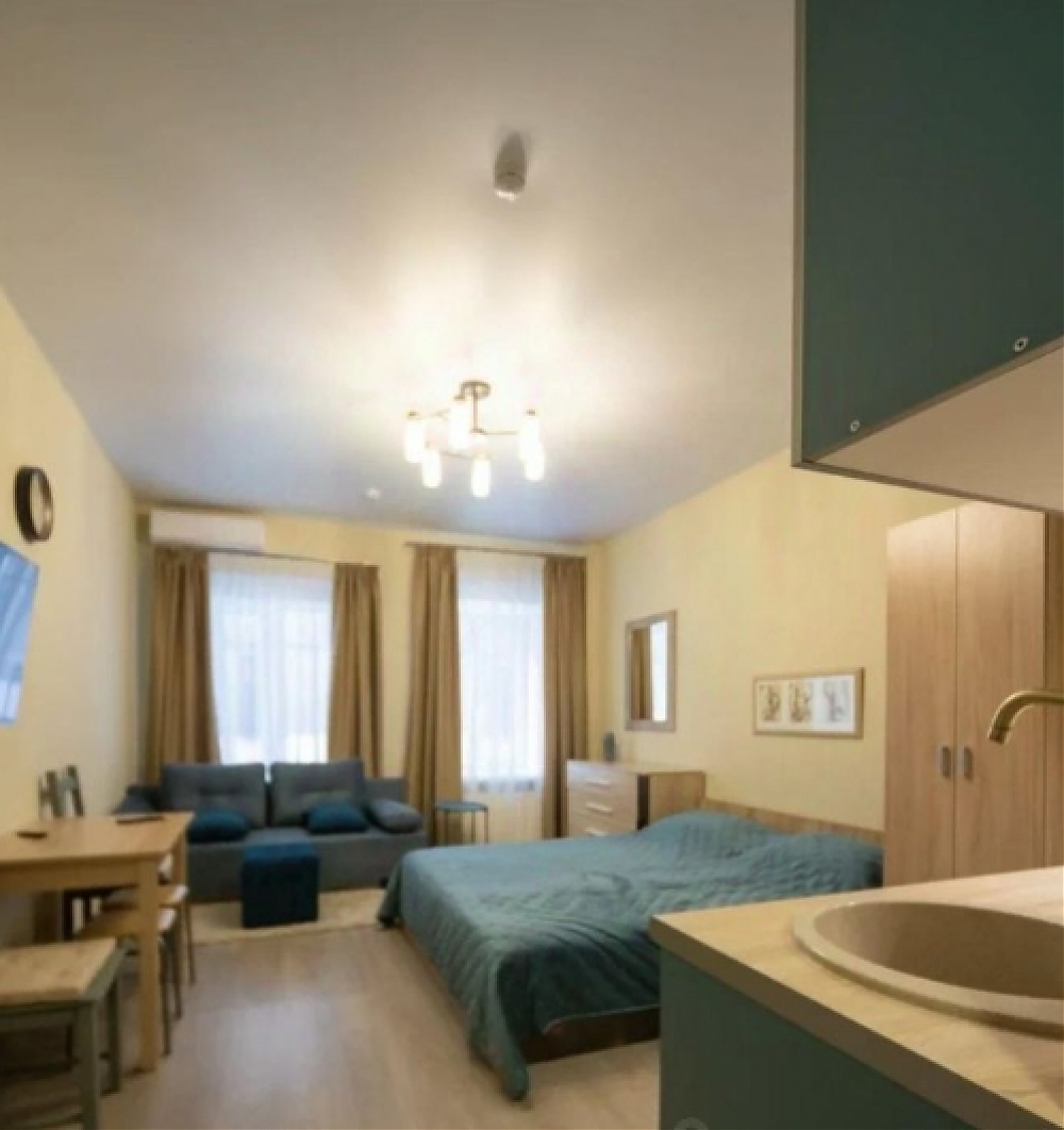 В апартаментах сделан дизайнерский ремонт с использованием качественных материалов. Пространство организовано с учетом всех деталей: кухня оснащена современной мебелью и бытовой техникой, включая холодильник, кондиционер и стиральную машину. В комнате также есть вся необходимая мебель для комфортного проживания. Санузел совмещенный, с душевой кабиной.