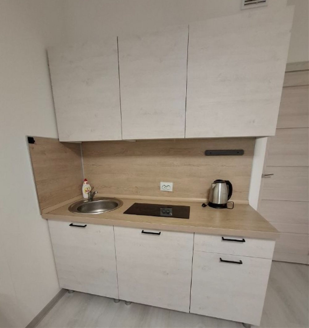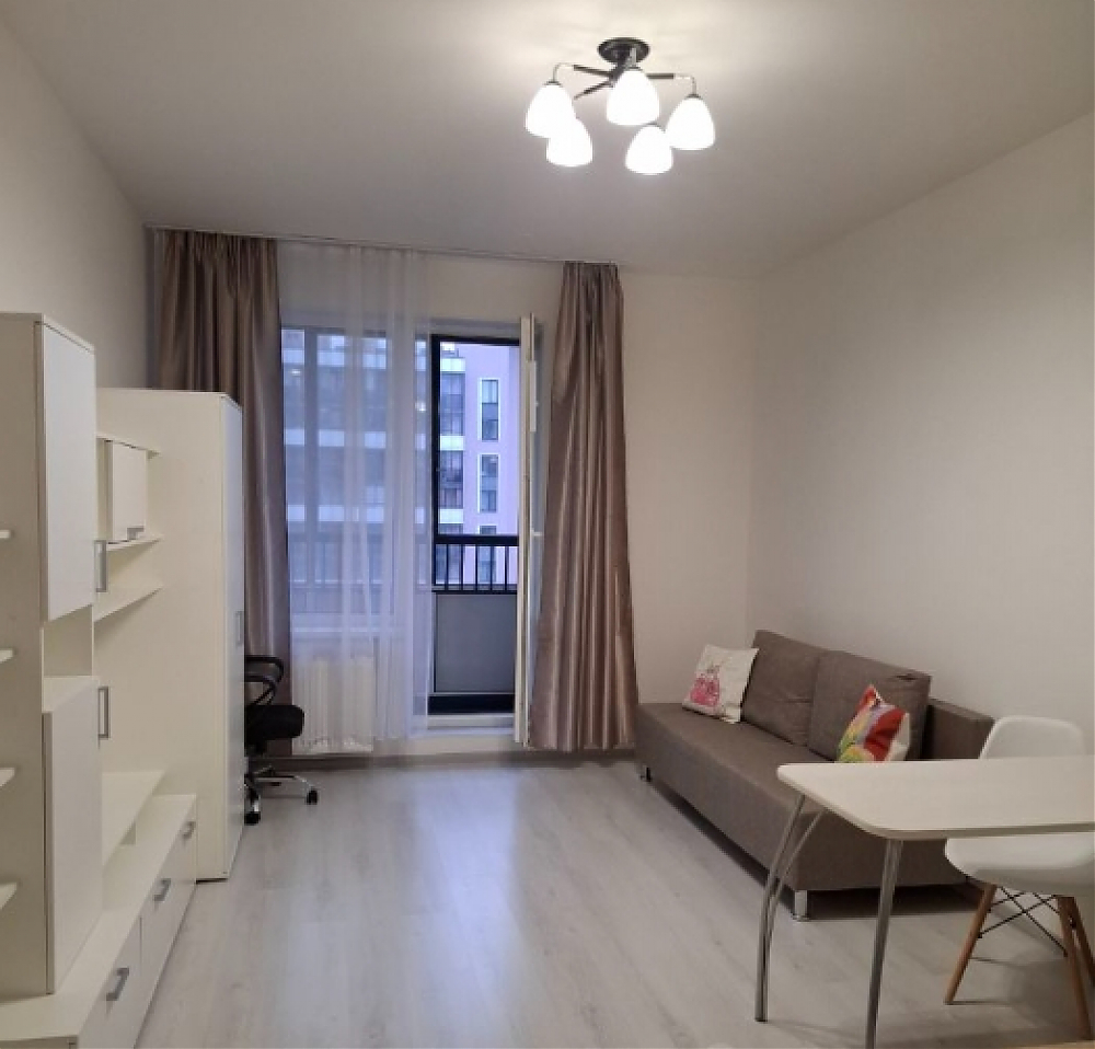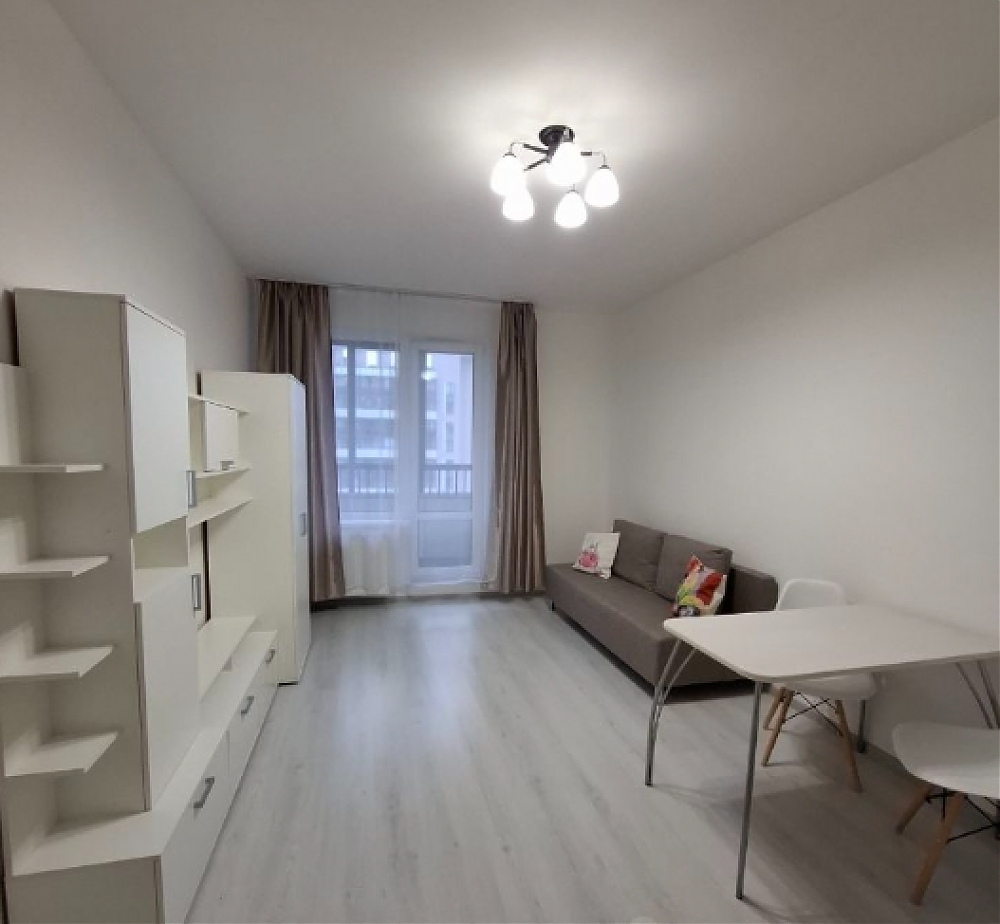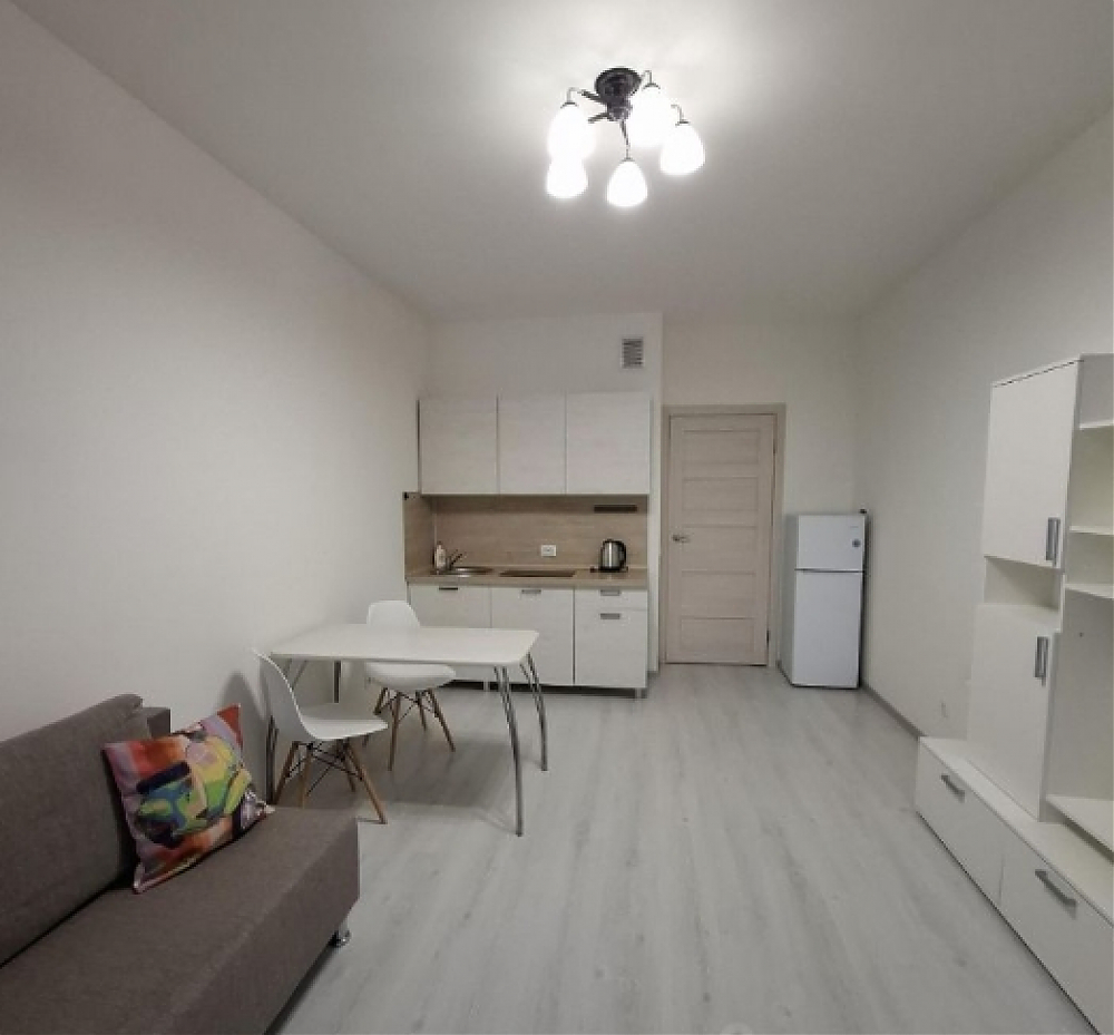 В студии есть все необходимое для комфортного проживания: современная мебель как в жилой зоне, так и на кухне. Из техники — холодильник и стиральная машина. В совмещенном санузле установлена душевая кабина, что делает пространство функциональным и удобным.