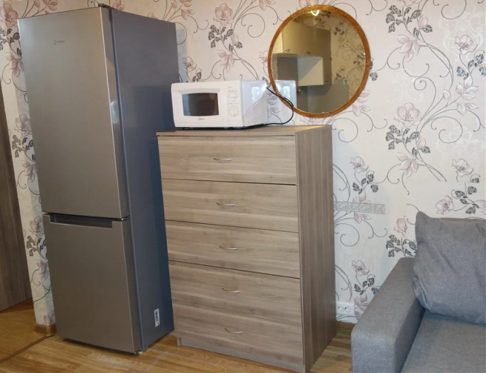 В студии есть все необходимое для комфортного проживания: современная мебель как в жилой зоне, так и на кухне. Из техники — холодильник и стиральная машина. В совмещенном санузле установлена душевая кабина, что делает пространство функциональным и удобным.