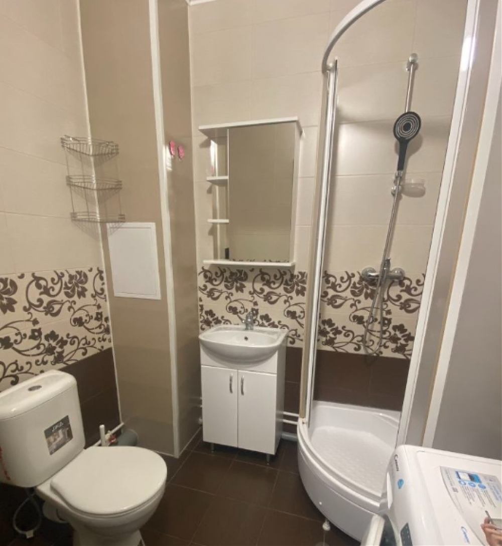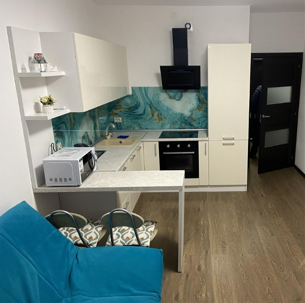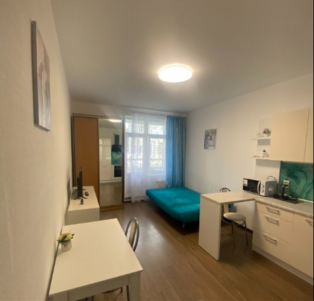 Квартира светлая и аккуратная, с косметическим ремонтом. В студии есть все необходимое для комфортного проживания: на кухне и в комнате установлена мебель, а также есть холодильник, телевизор, духовой шкаф, варочная панель и стиральная машина. Ванная комната оборудована душевой кабиной, что экономит пространство.