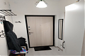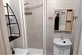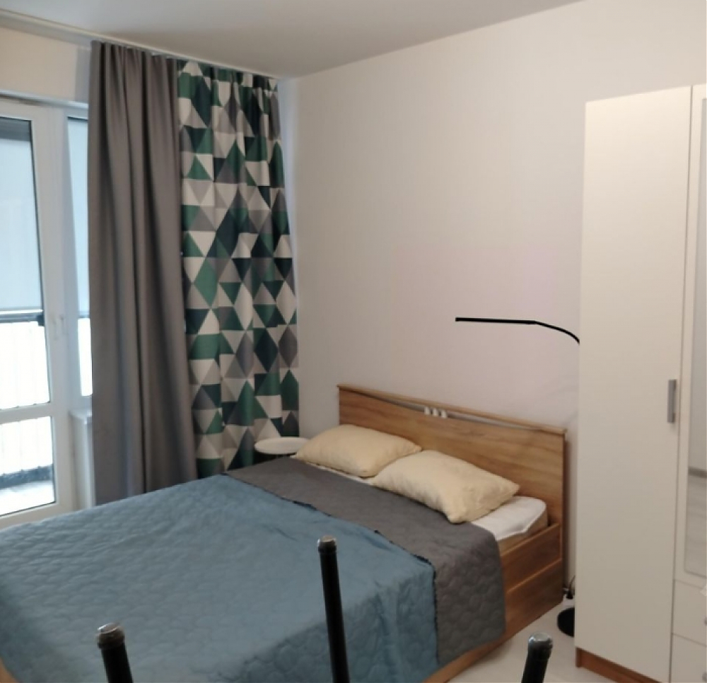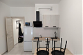 В студии выполнен евро ремонт, что видно по свежим отделке и качественным материалам. Просторная кухня оборудована необходимой техникой: холодильник, плита и микроволновая печь. Из мебели — вместительные шкафы и обеденный стол с двумя стульями.