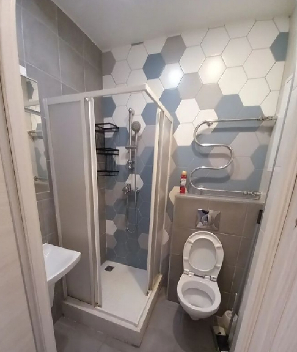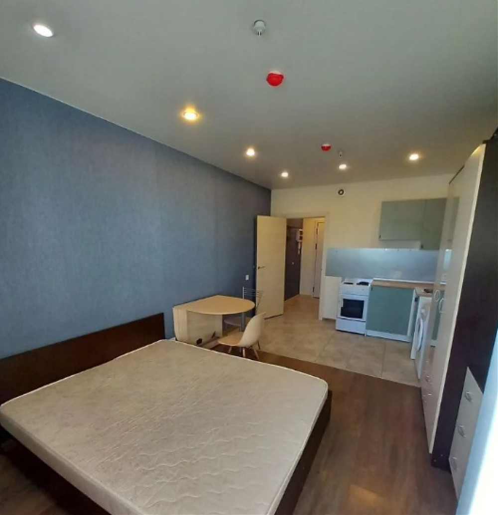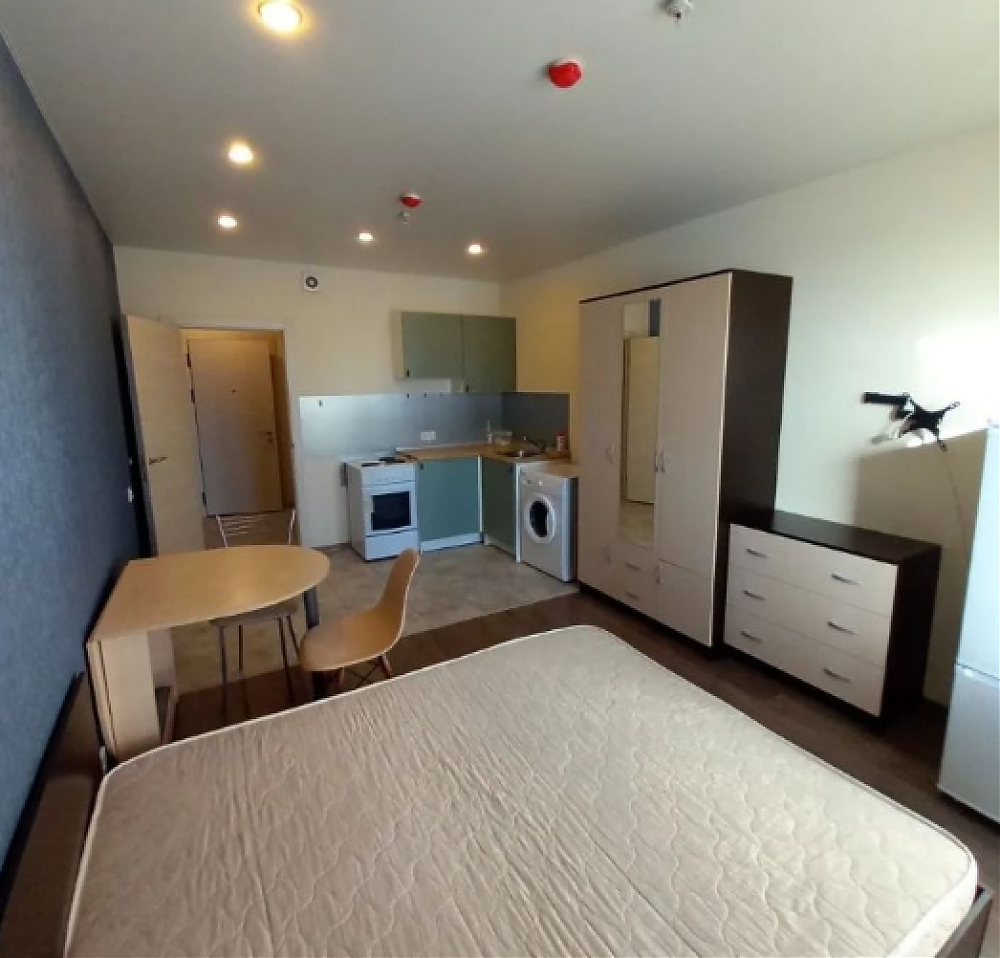 Студия сдаётся на длительный срок. Гости из СНГ, добро пожаловать. Фотографии свежие. Меблировка рассчитана на одного человека или семейную пару. Спальное место, кровать, шириной 160см. Бытовая техника: холодильник, стиральная машина, плита с духовкой. Для хранения вещей шкаф и комод.