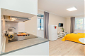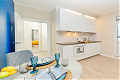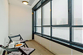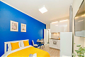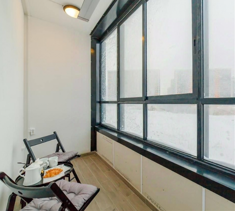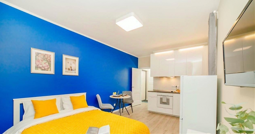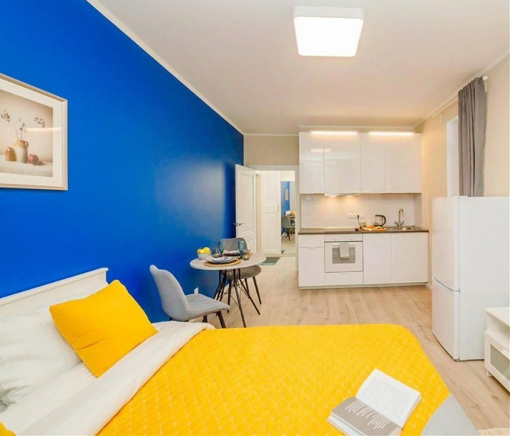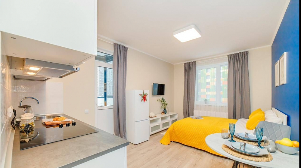 Эта квартира - гимн мягкому контрасту. Представьте: идеально белая мебель, нежный, цвета дуба пол - словно чистое полотно, на котором разворачивается история вашего уюта. Глубокий, насыщенный синий цвет акцентной стены задает ей настроение глубины и спокойствия, а яркие жёлтые и зелёные детали - подушки, плед, искусственные растения - разбавляют тишину искрами радости и жизни. Серые шторы деликатно обрамляют эту картину, позволяя свету играть главную роль. А света здесь предостаточно. Два больших окна, что редкая удача для студии, наполняют пространство воздухом с утра до вечера. Это идеальная сцена для вашего утра с чашкой кофе на просторной лоджии, оборудованной как комфортная зона отдыха, или для уютного вечера за просмотром фильма. В этой квартире есть всё для счастливого и спокойного бытия