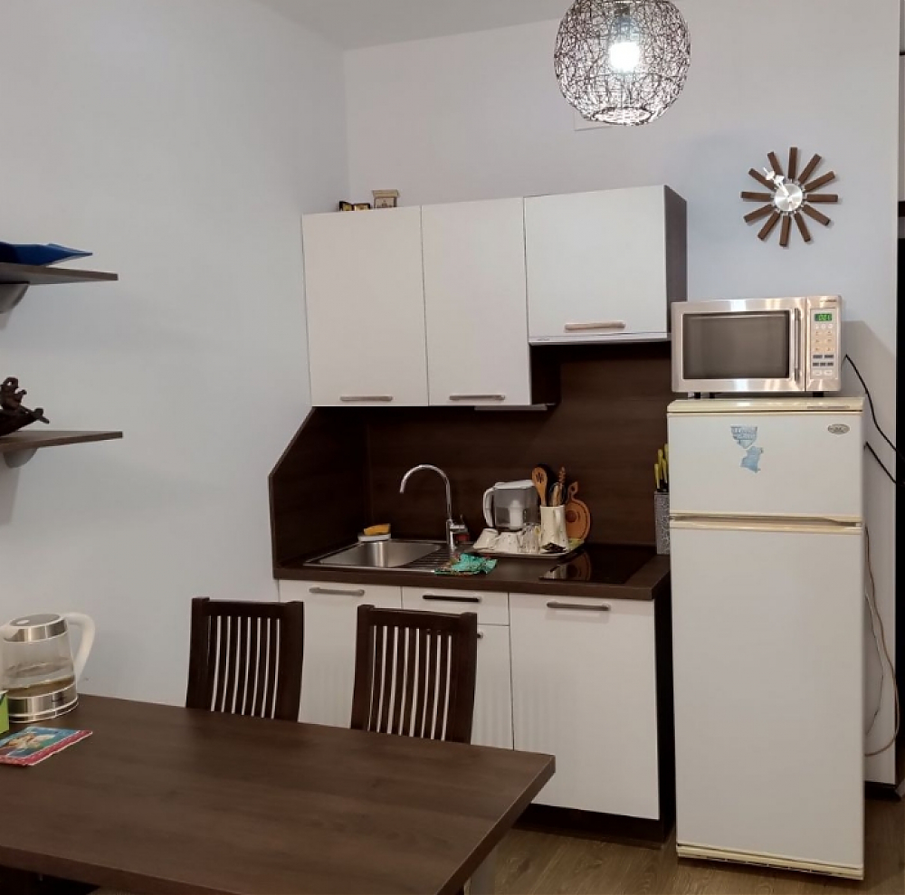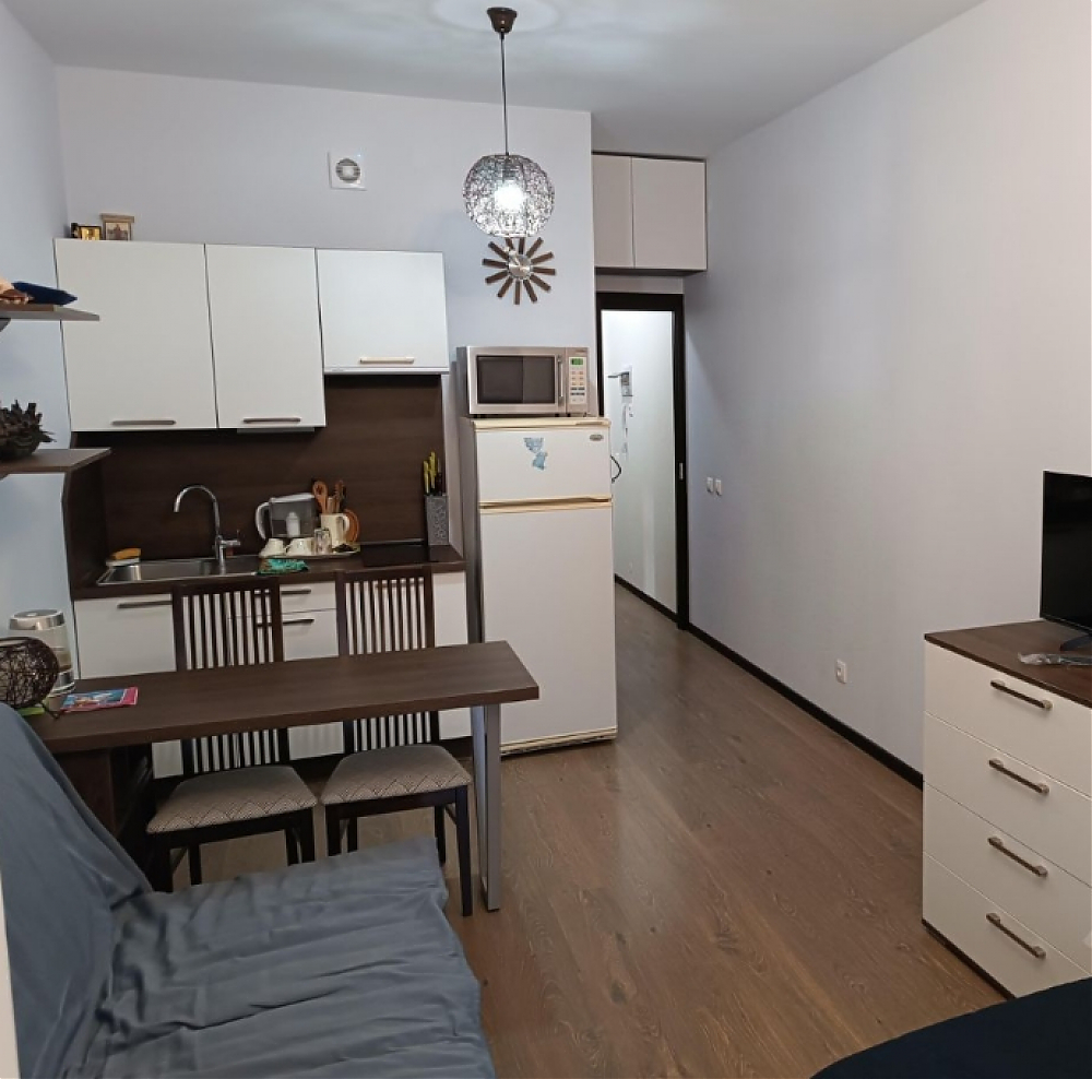 В квартире сделан косметический ремонт, что создаёт светлую и комфортную атмосферу. Здесь есть всё необходимое для комфортного проживания: удобная мебель на кухне и в комнате, а также необходимая техника — холодильник, телевизор и стиральная машина. В ванной комнате установлена душевая кабина. Изюминкой квартиры является наличие балкона, где можно обустроить уютное место для отдыха.