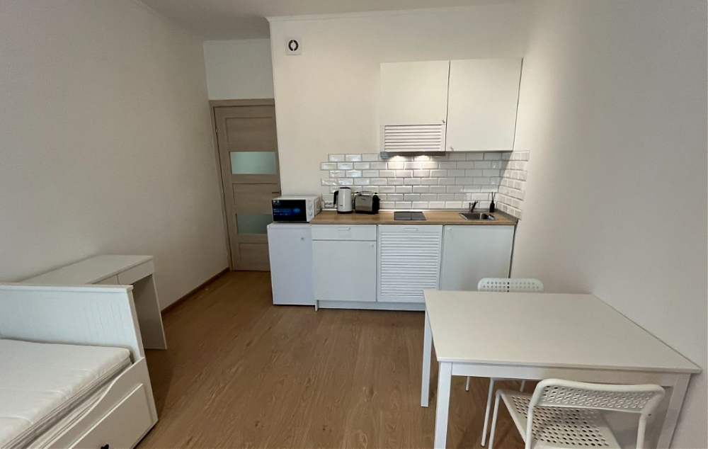 Сдам студию площадью 25 кв. м. Окна, выходящие во двор, обеспечивают тишину и комфорт. До метро "Комендантский проспект" 15-20 минут на транспорте
