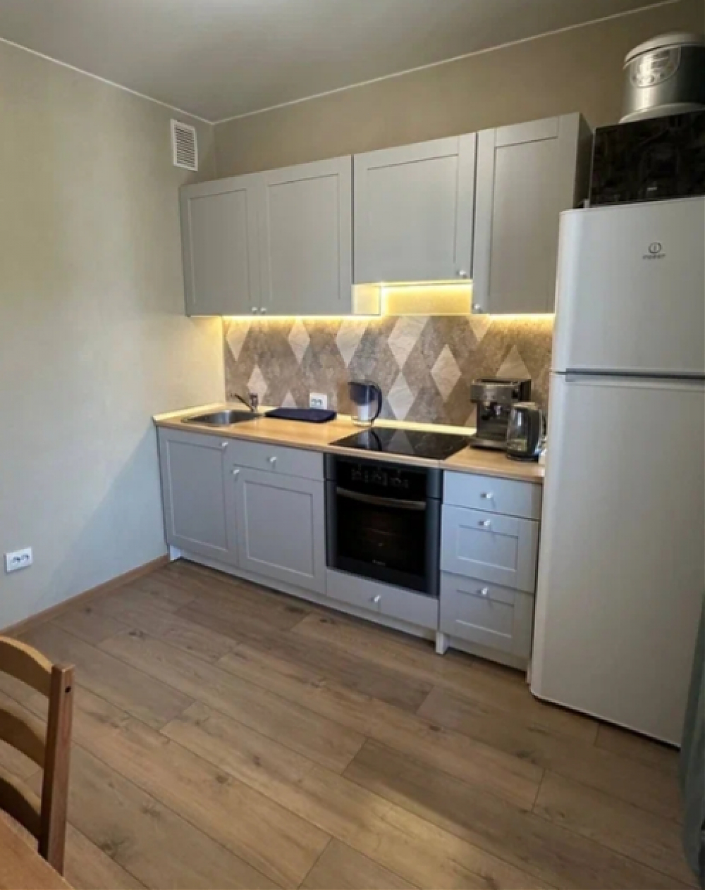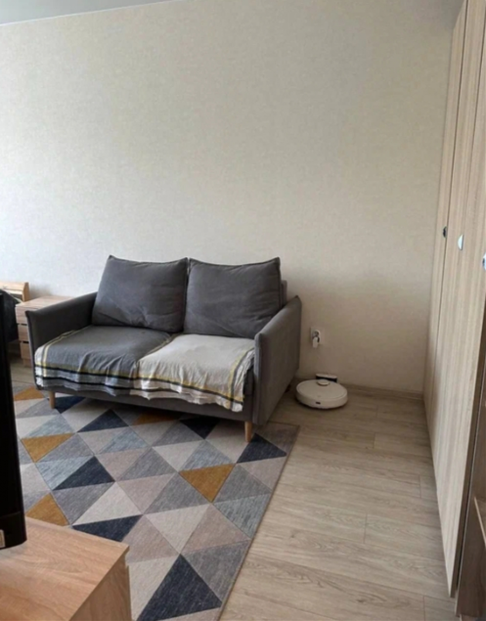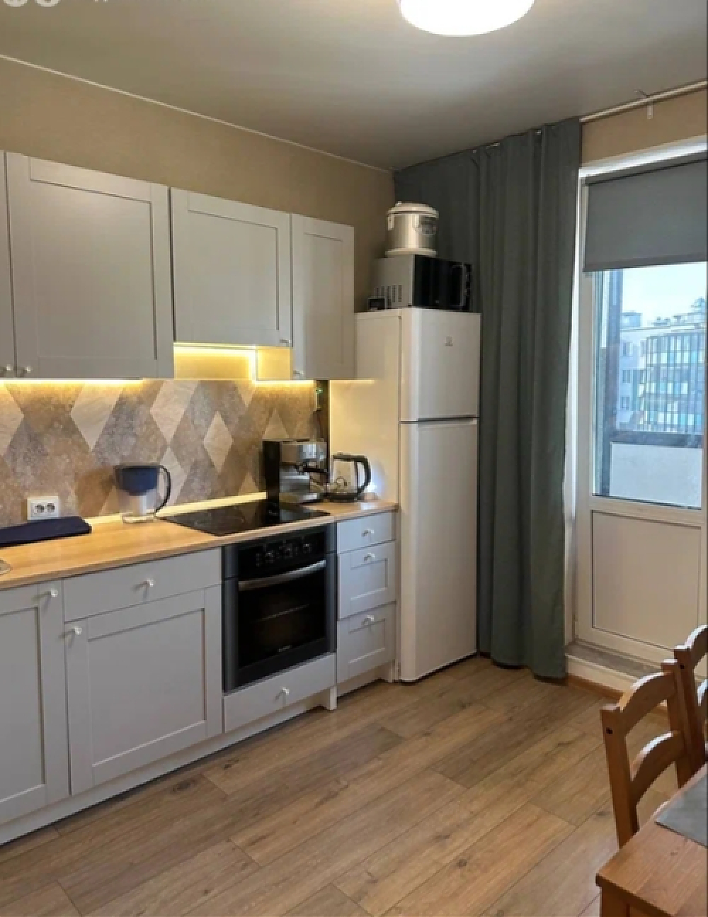 В квартире выполнен свежий евро ремонт, все комнаты изолированные. В комнате установлен удобный диван и вместительный шкаф. Из мебели также есть обеденный стол и стулья. В кухне современная бытовая техника: холодильник, варочная панель, духовой шкаф и микроволновая печь. Ванная комната совмещенная, оснащена душевой кабиной и стиральной машиной. Лоджия застеклена и оборудована полками для хранения вещей.