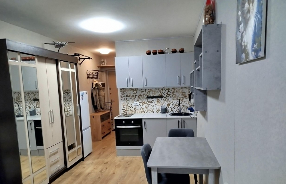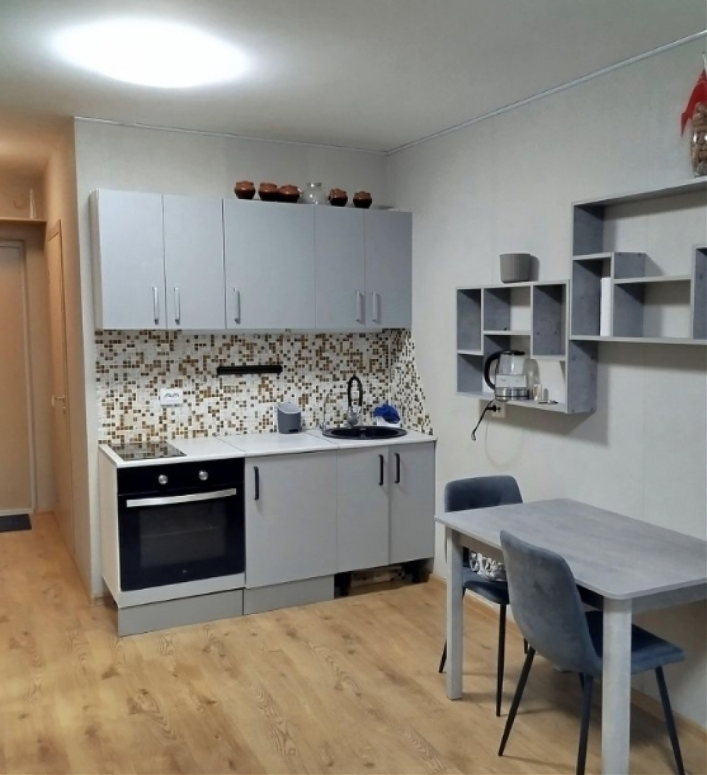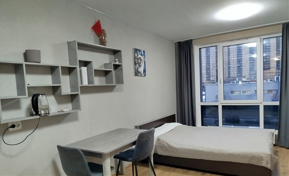Студия оформлена в современном стиле: здесь есть все необходимое для комфортного проживания. В квартиру проведен интернет. Полностью меблирована кухня и жилая зона, что позволяет сразу заселиться без лишних хлопот. Также в наличии холодильник, телевизор, стиральная машина, микроволновка, роутер и проточный водонагреватель (на случай отключения гв летом). Санузел совмещенный с душевой кабиной.