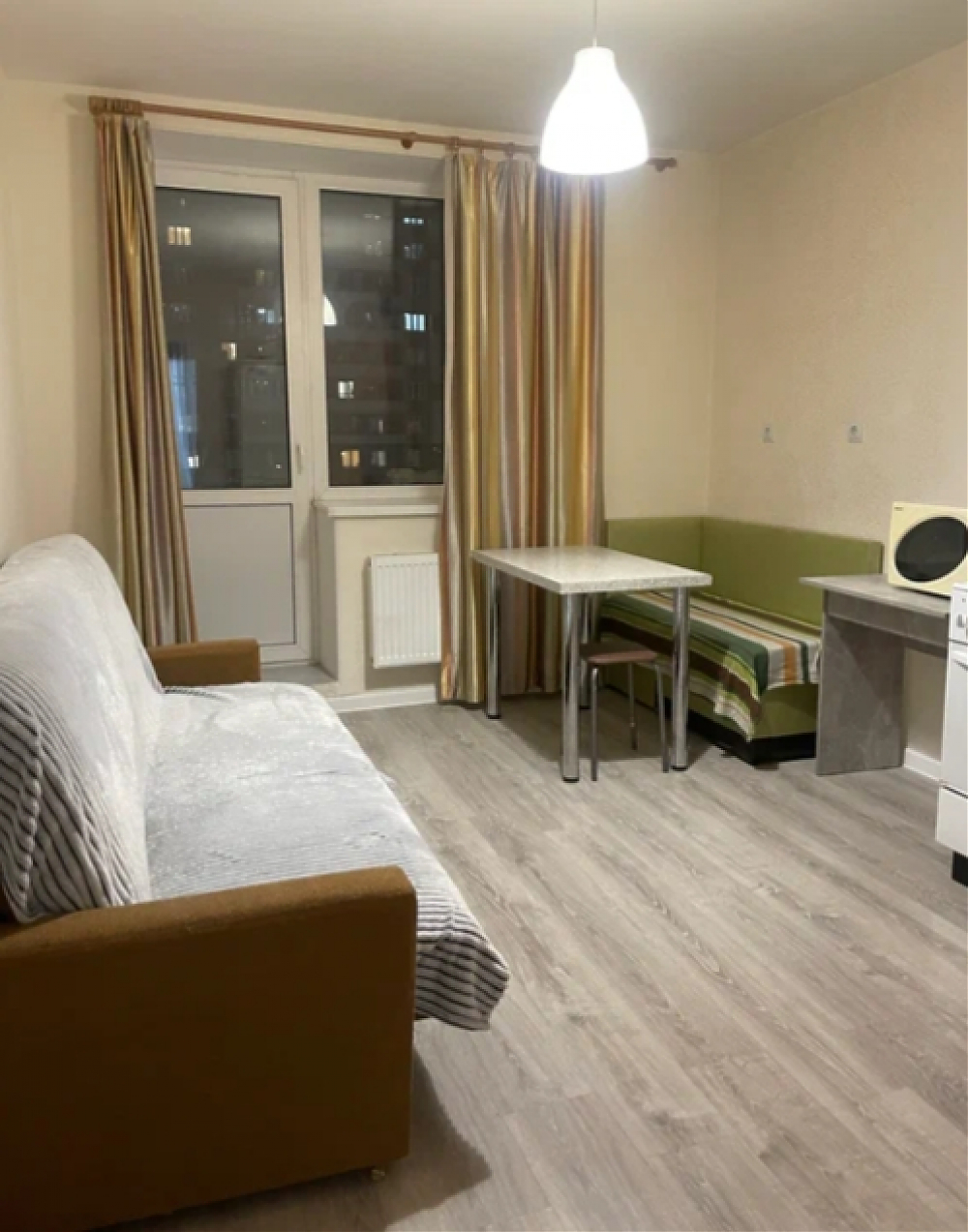 Сдается просторная, очень светлая квартира. Распашонка, кухня с балконом. Санузел раздельный, туалет большой с раковиной. В квартире есть все необходимое для проживания. В комнате двуспальный диван, стеночка, телевизор, комод. На кухне тоже двуспальный диван, кухонный гарнитур , стол, холодильник, микроволновка. Окна выходят в закрытые дворы с детскими и спортивными площадками. В торце дома находится школа. Дом современный, до метро 17 минут пешком и есть маршрутки. До прогулочной зоны вдоль реки Охта 10 минут.