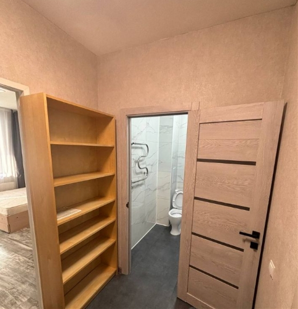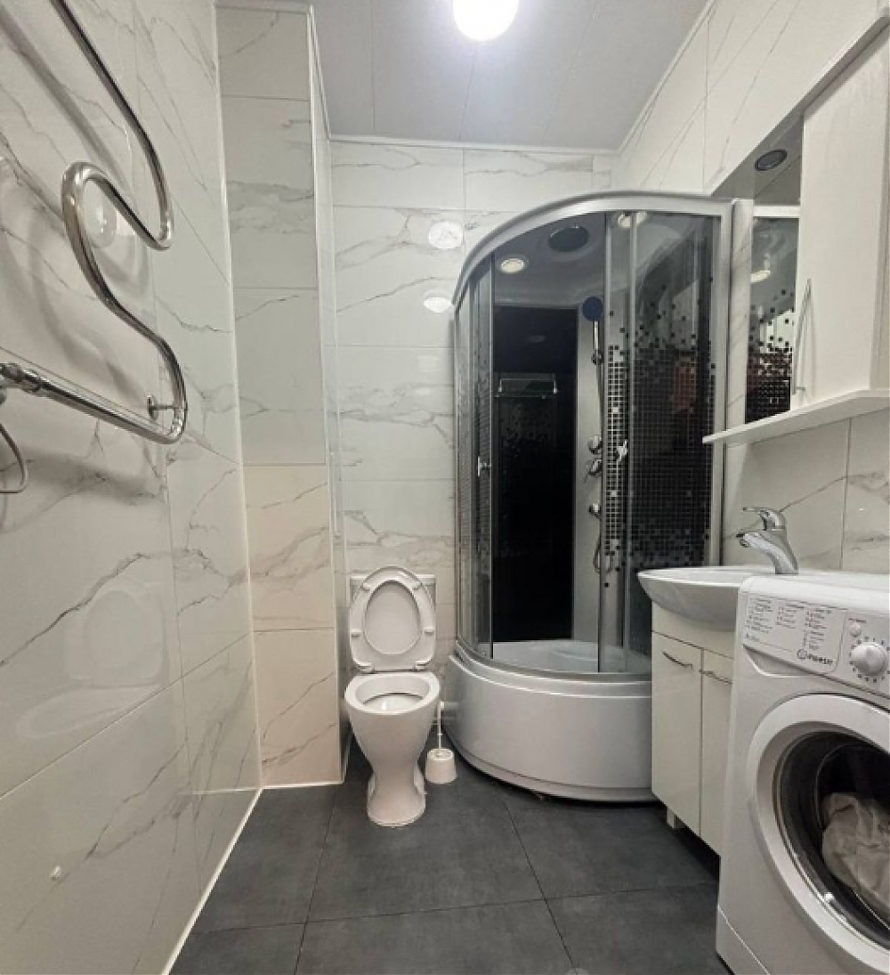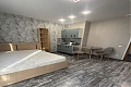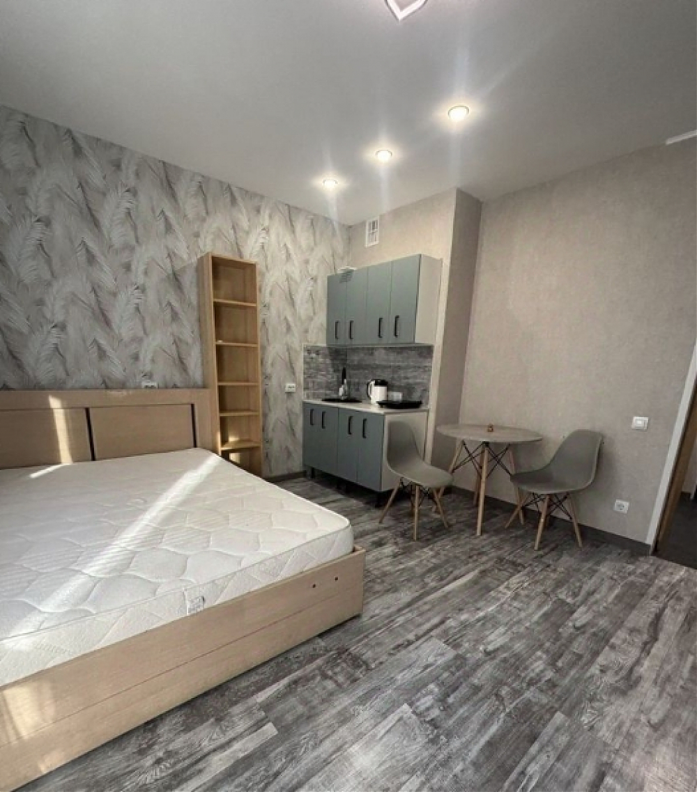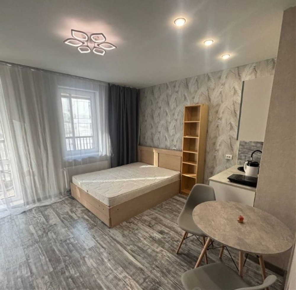 В квартире есть всё необходимое для комфортного проживания: современная мебель на кухне и в комнате, а также вся необходимая техника, включая холодильник и стиральную машину. Планировка студии включает совмещённый санузел с душевой кабиной и одну лоджию.