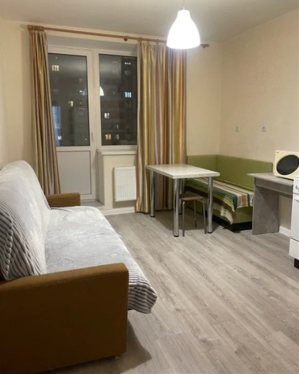 Сдается просторная, очень светлая квартира. Распашонка, кухня с балконом. Санузел раздельный, туалет большой с раковиной. В квартире есть все необходимое для проживания. В комнате двуспальный диван, стеночка, телевизор, комод. На кухне тоже двуспальный диван, кухонный гарнитур , стол, холодильник, микроволновка. Окна выходят в закрытые дворы с детскими и спортивными площадками. В торце дома находится школа. Дом современный, до метро 15 минут пешком и есть маршрутки. До прогулочной зоны вдоль реки Охта 10 минут.