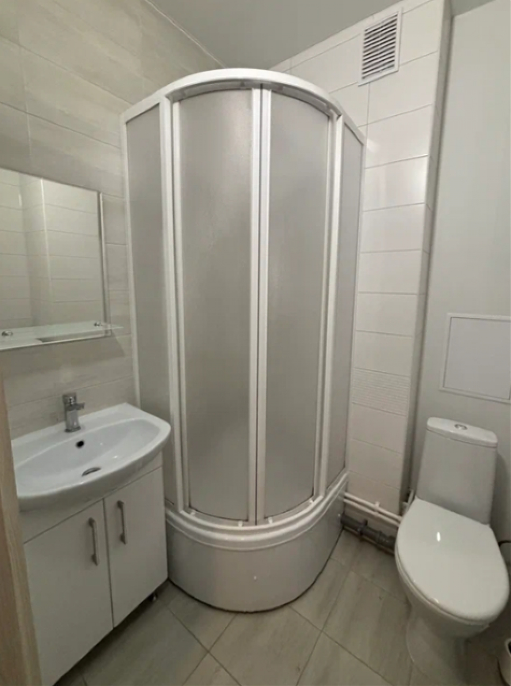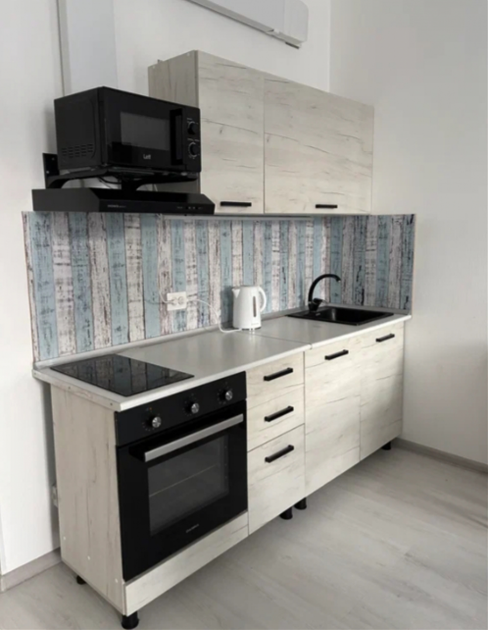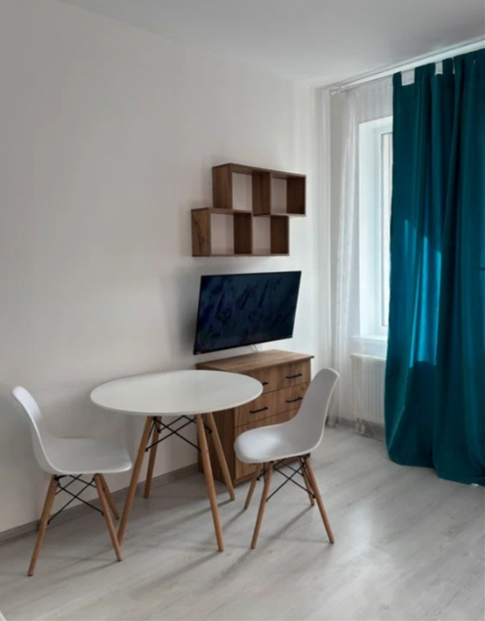 Сдается студия на длительный срок в ЖК Чистое небо. Бытовая техника: холодильник, плита, микроволновая печь и стиральная машина. В комнате установлен телевизор и диван, а также имеется обеденный стол с двумя стульями. Отдельно рабочий стол. Гладильная доска, сушилка для белья. В коридоре встроенный шкаф с большим зеркалом. Санузел совмещенный с душевой кабиной.