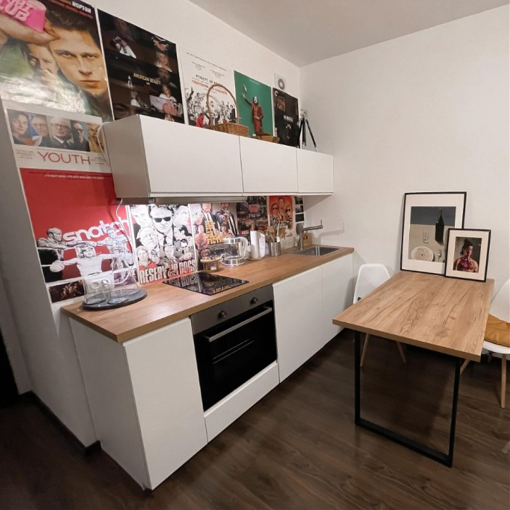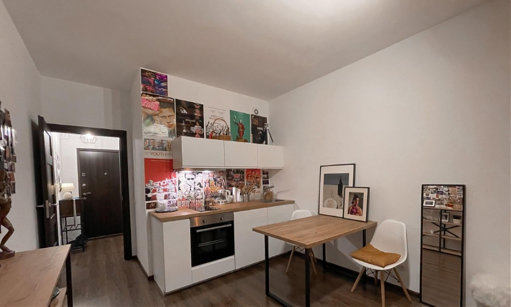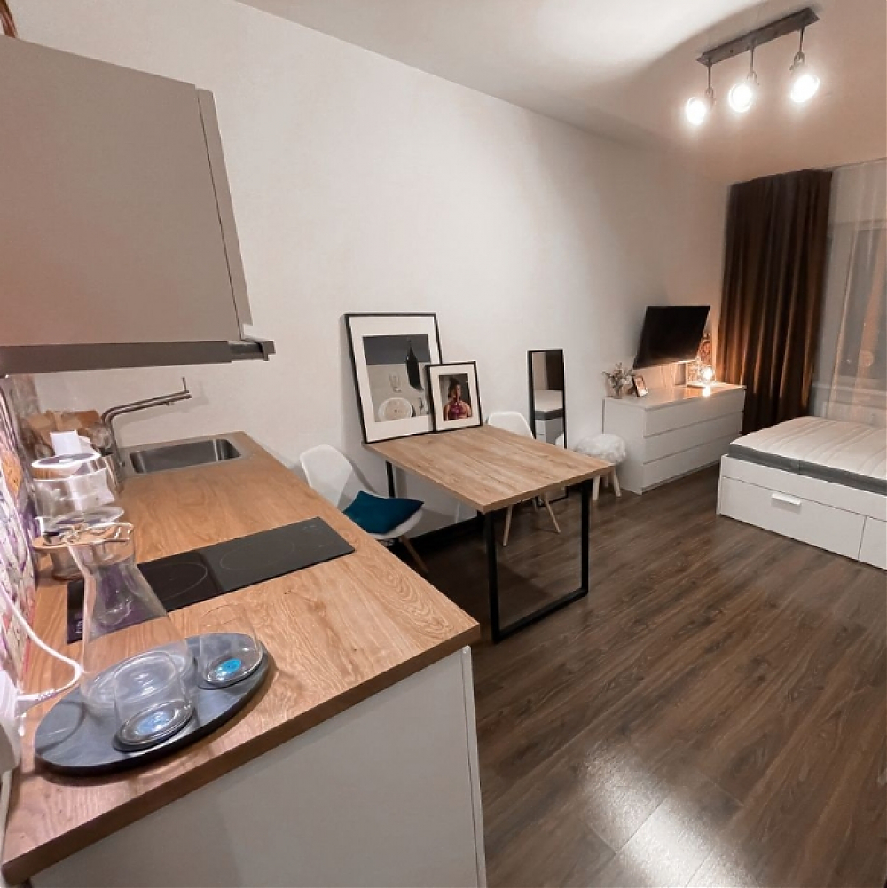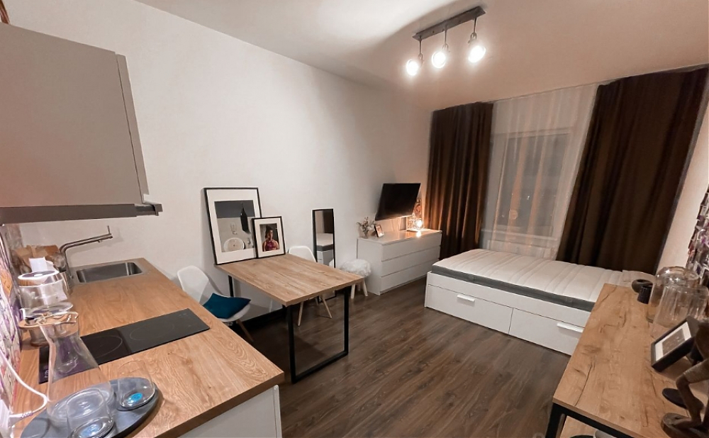 Сдается уютная студия для 1, максимум 2-ух человек. Все, что вы видите на фото, остается - от мелкого декора и посуды до мебели и бытовой техники. Телевизор Sony на подвижном кронштейне - можно его смотреть как с кухонной зоны, так и со спальной. Под телевизором тумба с 6 ящиками для хранения. Кровать с матрасом, подушками и одеялами, снизу еще 4 ящика для хранения. На кухне: двухконфорочная варочная панель, духовой шкаф, встроенный холодильник, мультиварка, микроволновка и чайник. В ванной комнате душевая кабина, стиральная машина, сушилка для вещей и утюг. Квартира находится в новом ЖК Чистое небо на 22 этаже. Район полностью обустроен - в пешей доступности есть все необходимые магазины, кафе и места для отдыха. До автобусной остановке идти 3-5 минут. Также, рядом нет строящихся домов, а окна выходят во двор - нет шума и пыли. Еще из окна виден Лахта центр и Зенит арена.