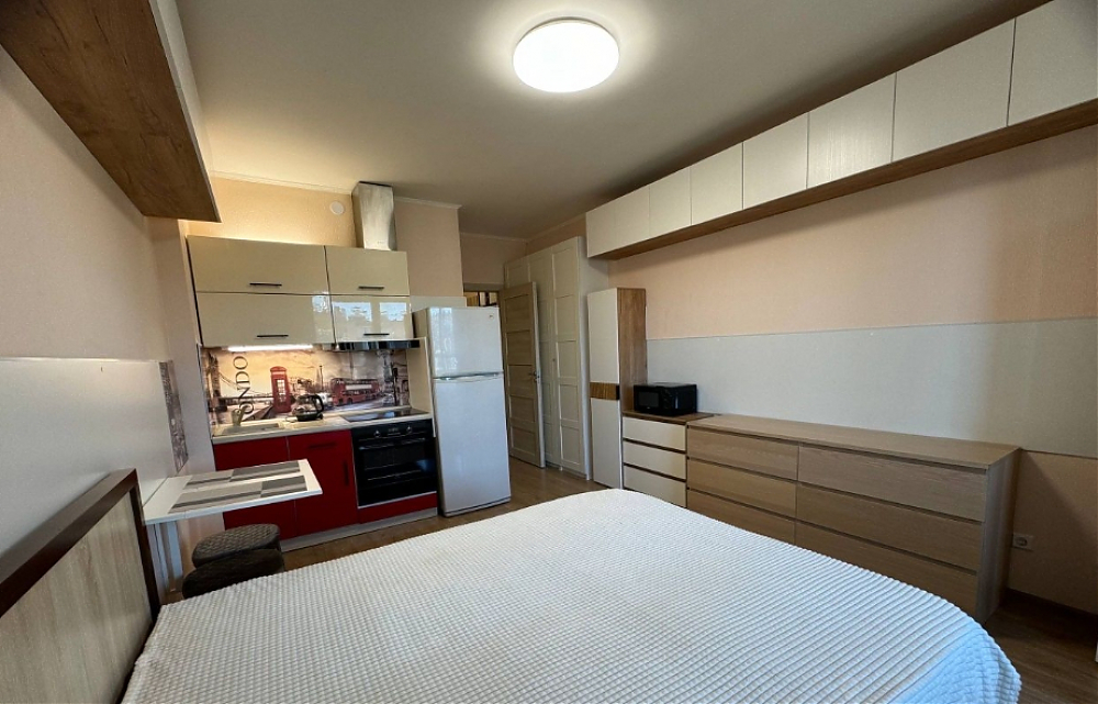 Сдаю уютную квартиру-студию с Мебелью и Техникой. В квартире установлена обустроенная кухня с плитой, духовкой и вытяжкой, новая кровать с матрасом, большой шкаф для хранения, комод; техника: телевизор, холодильник, стиральная машинка, микроволновая печь, электрический чайник. Развитый район, чистая территория, тихий, закрытый, круглосуточно охраняемый двор. Удобное расположение дома, 2 минуты пешком до остановки общественного транспорта на проспекте Ветеранов. В шаговой доступности магазины, кофейни, торговые центры, фитнес центр. Сдается аккуратной, платежеспособной, без вредных привычек: Одной девушке, без детей и животных.