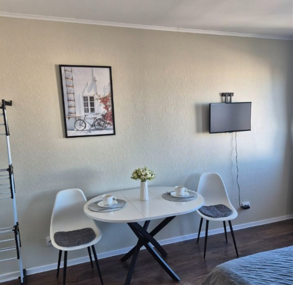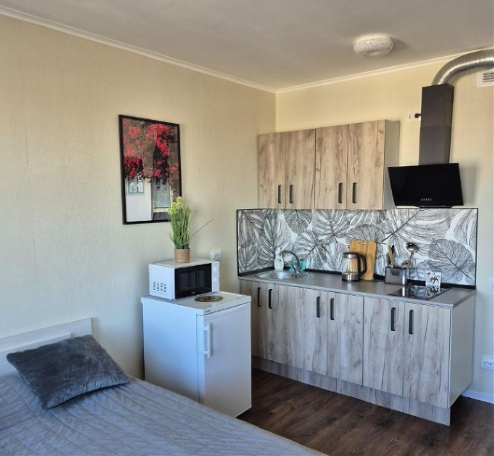Квартира с евроремонтом, полностью готова для комфортного проживания. В квартире есть вся необходимая техника: холодильник, стиральная машина, телевизор (смарт, с доступом в итернет), утюг, фен, миксер, чайник, микроволновая печь. Вам ничего не придется покупать, в наличии 2 комплекта постельного белья, полотенца, гладильная доска, компактная и вместительная сушилка для белья, электрический полотенцесушитель. Посуда есть вся: кастрюли, сковорода и вся прочая кухонная утварь, которая нужна на кухне. Мебель установлена как на кухне, так и в комнате: вешалка у входа, вместительный шкаф, комод, а в ванной комнате предусмотрена душевая кабина. Планировка студии позволяет рационально использовать пространство, создавая уютную атмосферу для жизни.