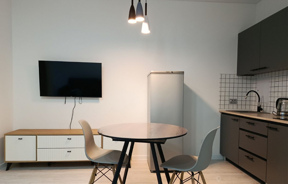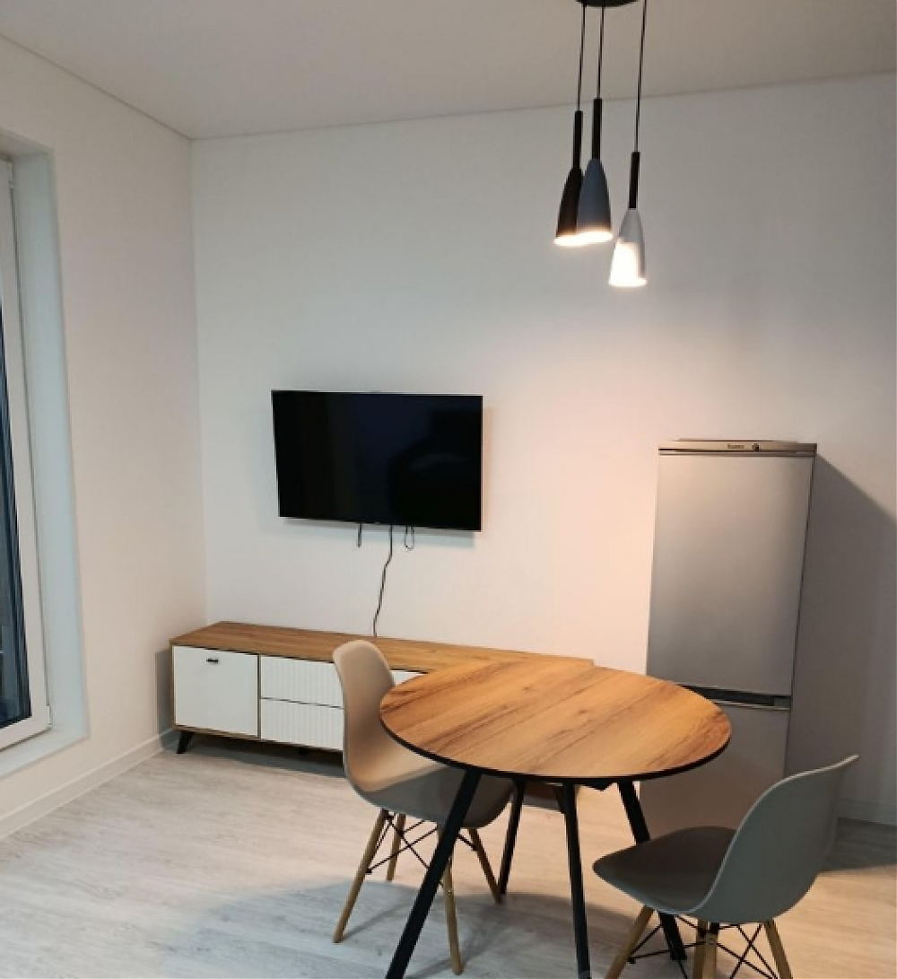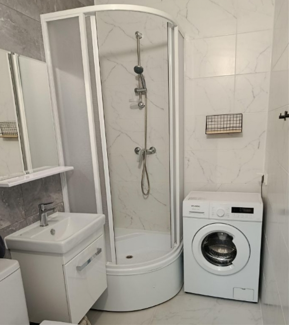 В квартире сделан евроремонт. Обстановка включает в себя всю необходимую мебель и технику: холодильник, телевизор и стиральную машину. Санузел совмещённый, оборудован современной душевой кабиной. Также есть лоджия, где можно наслаждаться свежим воздухом.
